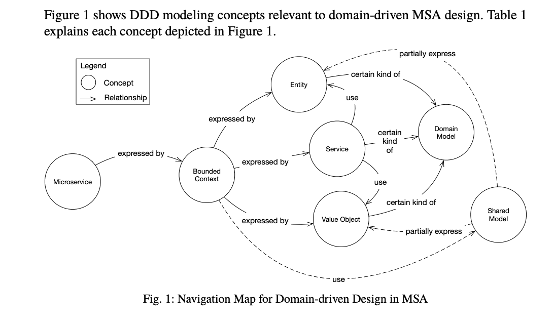 The microservice is expressed by a bounded context, which is connected via entities, services and value objects to a corresponding domain model (relevant just to the domain) and to a shared model (able to be shared with other domains; used to communicate between domain models). This modeling methodology can be used to identify important interconnections.